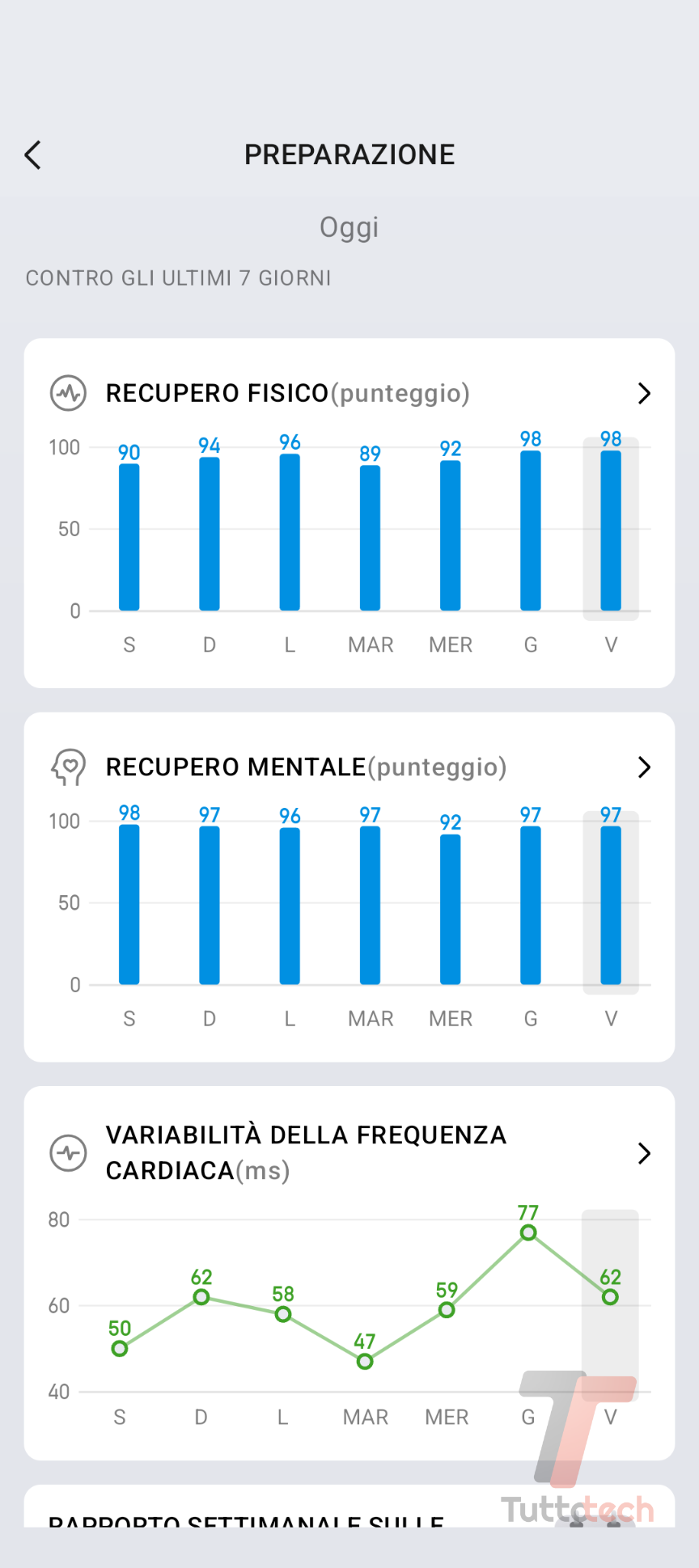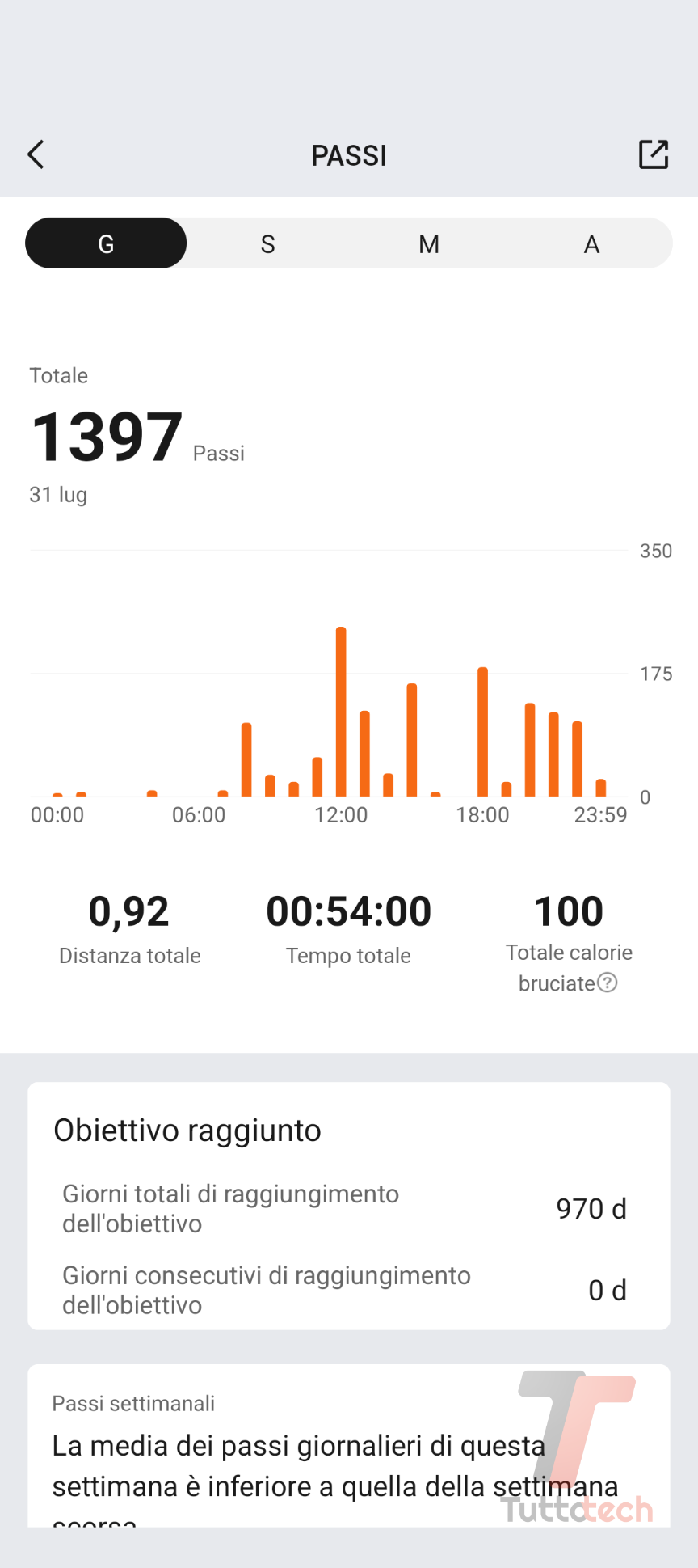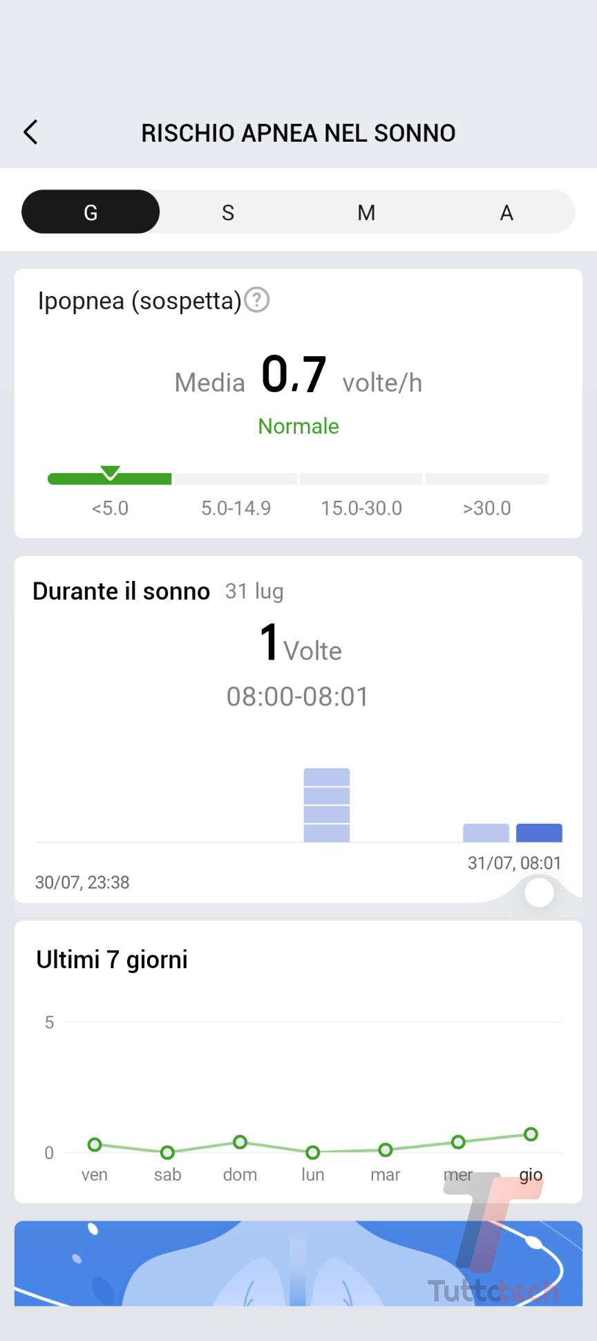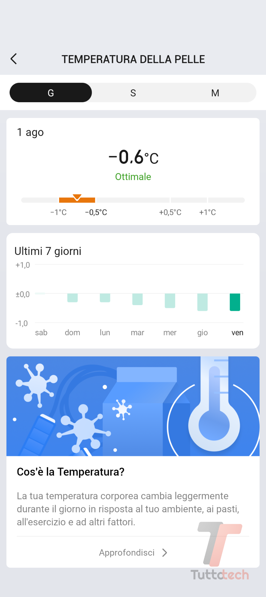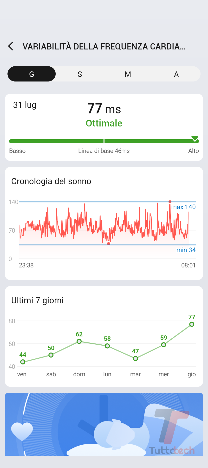 Da quello che abbiamo potuto vedere è sempre stato così e non ha mai perso un colpo nelle misurazioni risultando sempre sul pezzo e affidabile, soprattutto per quanto riguarda la frequenza cardiaca dato che è il parametro vitale che misura più soggetto a variazioni. Lui poi non si limita a mostrare i dati raccolti in modo misero, cosa comunque possibile, ma, così come per il sonno, li mixa fra loro per fornire delle funzioni sulla salute un po’ più articolate, fatte di andamenti, bei grafici ricchi di dettagli e consigli, sia tramite l’applicazione per smartphone che tramite il suo display. Può misurare i valori in tempo reale, in base agli intervalli selezionati nelle impostazioni oppure manualmente su richiesta, perciò offre un’ampia scelta per quanto riguarda il monitoraggio. Le uniche sua mancanze da questo punto di vista riguardano l’assenza di funzioni avanzate e attuali per il monitoraggio della salute, come ECG, rigidità arteriosa, pressione sanguigna, BIA e indice antiossidanti, che invece bene o male ritroviamo nei suoi diretti concorrenti e che gli avrebbero permesso di essere uno strumento ancora più completo sotto questo aspetto.
