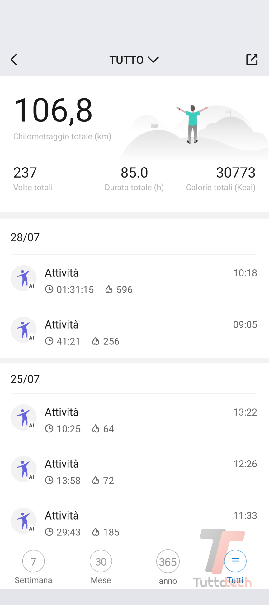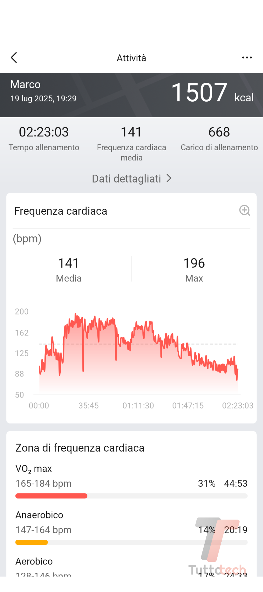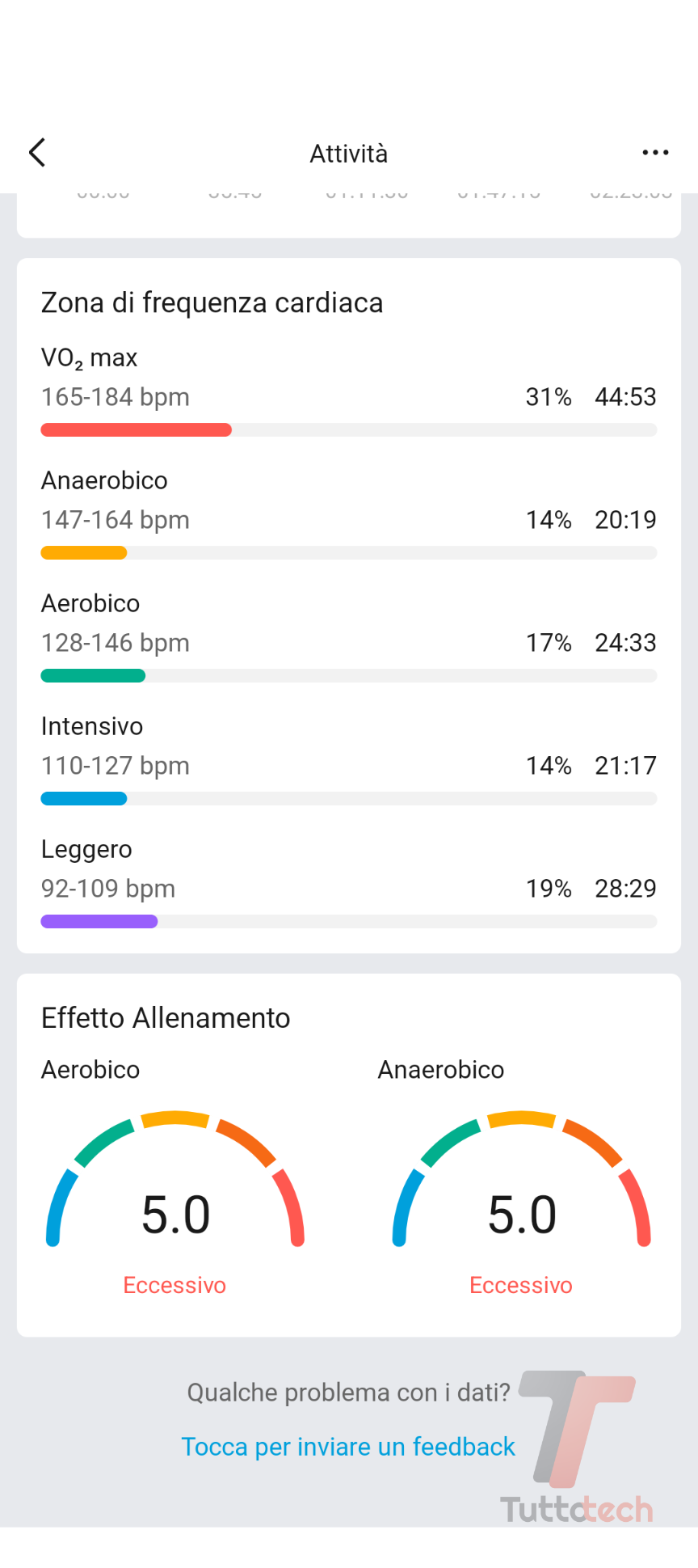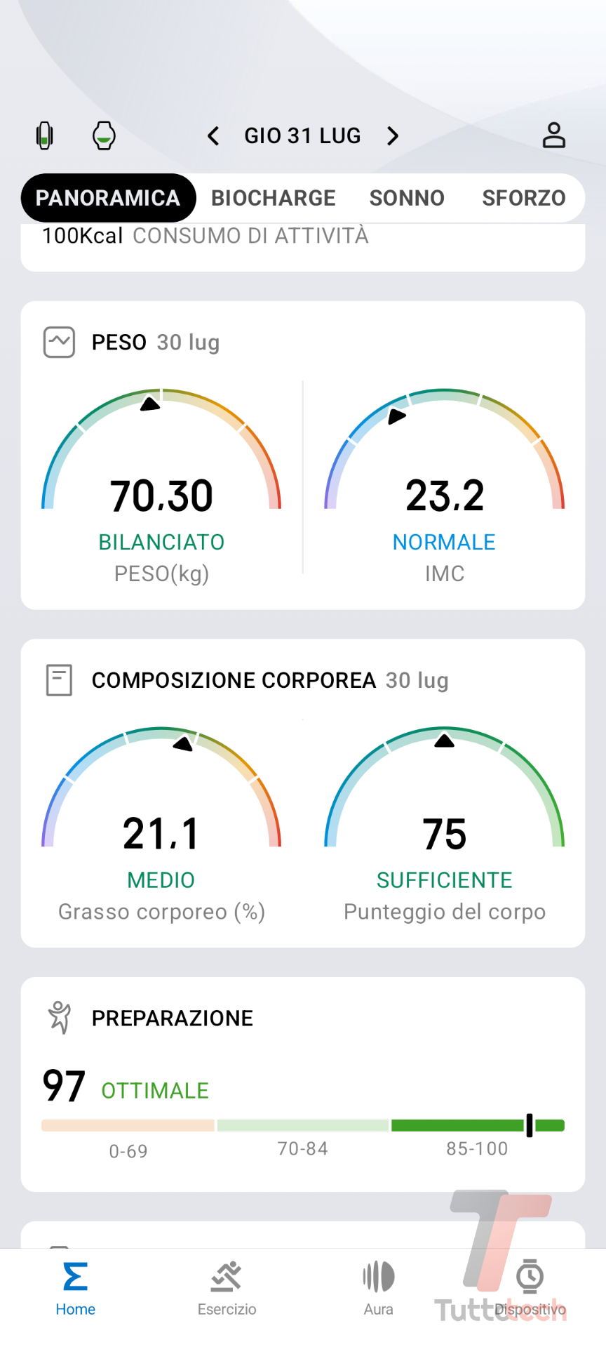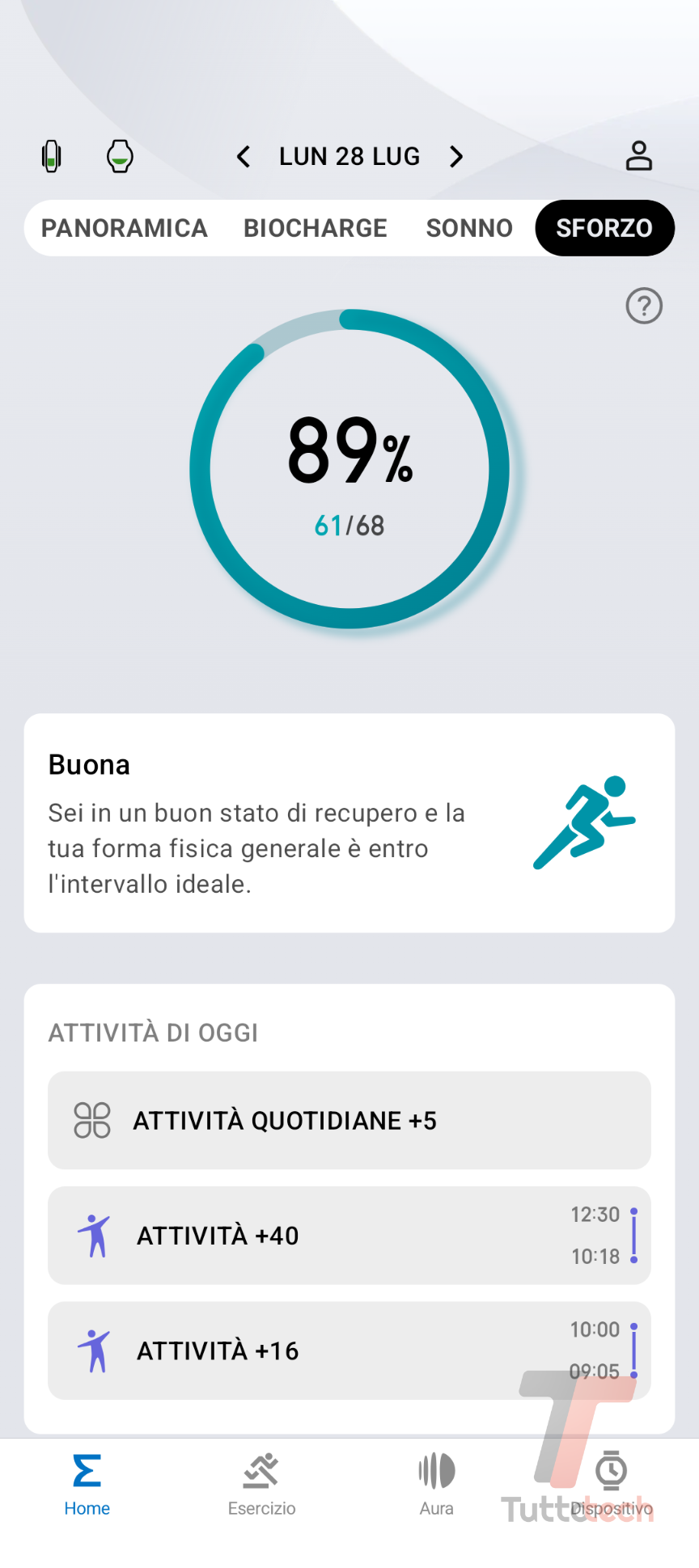 Da quello che abbiamo potuto vedere è sempre stato così e non ha mai perso un colpo nelle misurazioni risultando sempre sul pezzo e affidabile, soprattutto per quanto riguarda la frequenza cardiaca dato che è il parametro vitale che misura più soggetto a variazioni. Lui poi non si limita a mostrare i dati raccolti in modo misero, cosa comunque possibile, ma, così come per il sonno, li mixa fra loro per fornire delle funzioni sulla salute un po’ più articolate, fatte di andamenti, bei grafici ricchi di dettagli e consigli, sia tramite l’applicazione per smartphone che tramite il suo display. Può misurare i valori in tempo reale, in base agli intervalli selezionati nelle impostazioni oppure manualmente su richiesta, perciò offre un’ampia scelta per quanto riguarda il monitoraggio. Le uniche sua mancanze da questo punto di vista riguardano l’assenza di funzioni avanzate e attuali per il monitoraggio della salute, come ECG, rigidità arteriosa, pressione sanguigna, BIA e indice antiossidanti, che invece bene o male ritroviamo nei suoi diretti concorrenti e che gli avrebbero permesso di essere uno strumento ancora più completo sotto questo aspetto.