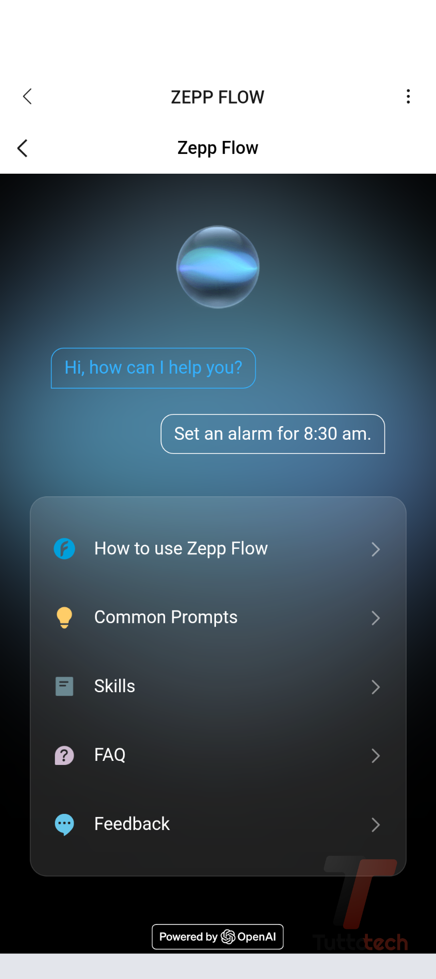 Ed è proprio questo il suo aspetto chiave lato smart perché Zepp Flow è un vero e proprio assistente vocale e in quanto tale non solo permette di rispondere ai messaggi con la voce ma permette anche di eseguire un sacco di azioni come un qualsiasi altro assistente vocale: infatti lui si basa sullo stesso motore di ChatGPT e permette di fare di tutto, come avviare attività sportive, alzare il volume dell’altoparlante, aumentare la luminosità del display, fare ricerche, di conoscere le previsioni meteo e di fare un sacco di altre cose; e tutto questo con un’ottima reattività, con una grafica abbastanza moderna e tramite scorciatoie all’interno delle watchface, applicazione dedicata e persino un widget. A ciò si aggiungono una serie di applicazioni e di personalizzazioni utili a renderlo ancora più smart e personale: basti pensare che lui può contare su uno store proprietario di mini applicazioni con cui poter aver accesso alle funzioni più comuni di cui si ha bisogno, oltre a tante applicazioni preinstallate per la salute, per la quotidianità, per i promemoria, per lo sport e per la parte smart; non mancano, infatti, sveglia, promemoria, memo vocale, meteo, calendario, tessere associative, barometro, bussola, ciclo mestruale, musica (con possibilità di riprodurne anche dallo storage interno di 32 GB), sole e luna, altimetro, cronometro, conto alla rovescia, elenco delle cose da fare, pomodoro timer e soprattutto Zepp Pay, che è l’applicazione proprietaria per effettuare i pagamenti digitali tramite NFC e wallet Curve. Per finire una considerazione sulla vibrazione, elemento fondamentale non solo per la sveglia e per la navigazione all’interno del sistema tramite tasto a rotella ma anche e soprattutto per le notifiche: lui ha un feedback aptico di ottimo livello e quasi paragonabile a quello di un Pixel di recente generazione perché è bello secco (del tipo toc toc toc…), è corposo, è forte ed è preciso quando abbinato alle interazione di sistema. Oltre che del Bluetooth è dotato anche della connessione Wi-Fi, ma come nei suoi tanti fratelli non serve granché perché permette appena di scaricare gli aggiornamenti di sistema.