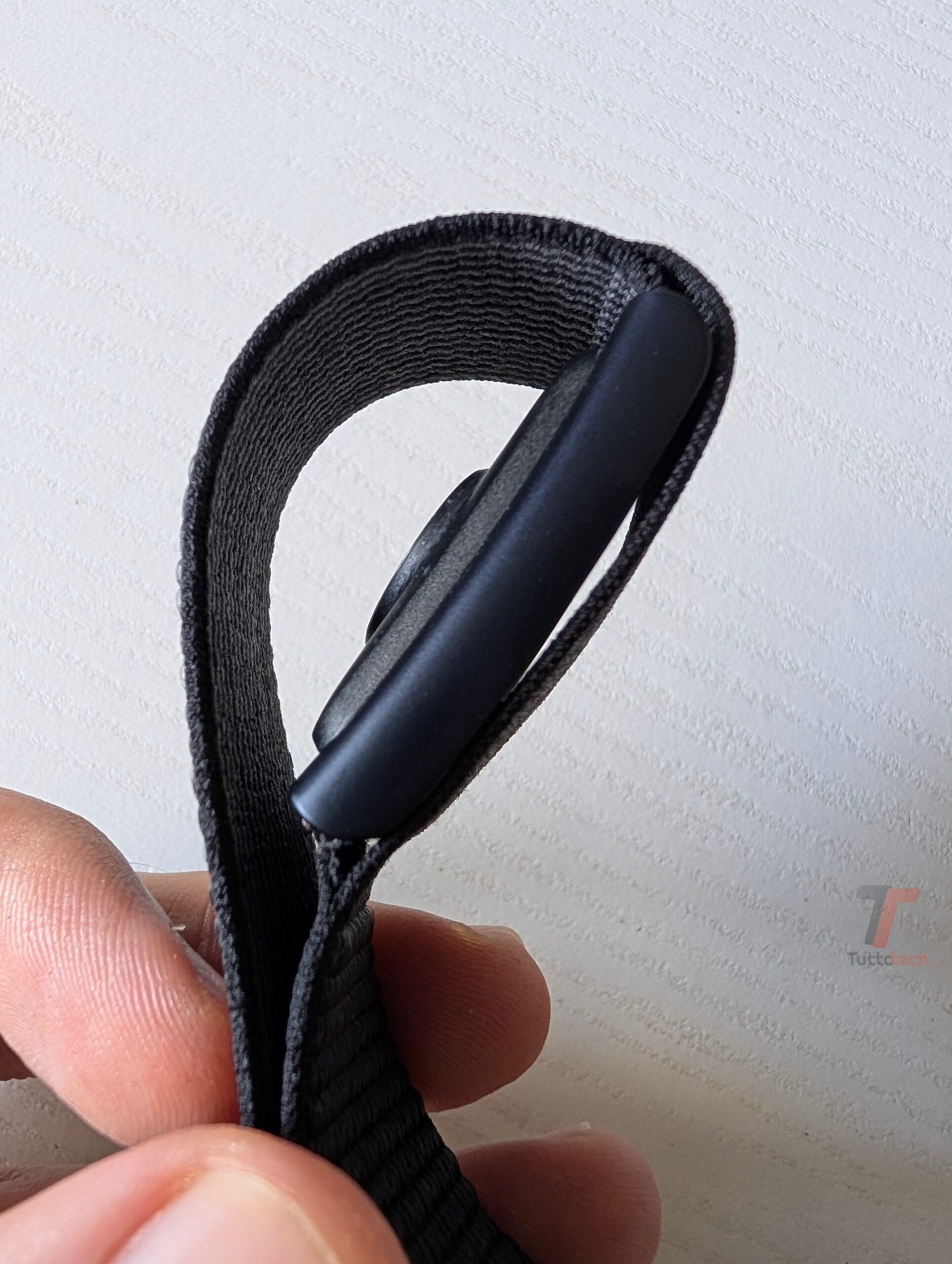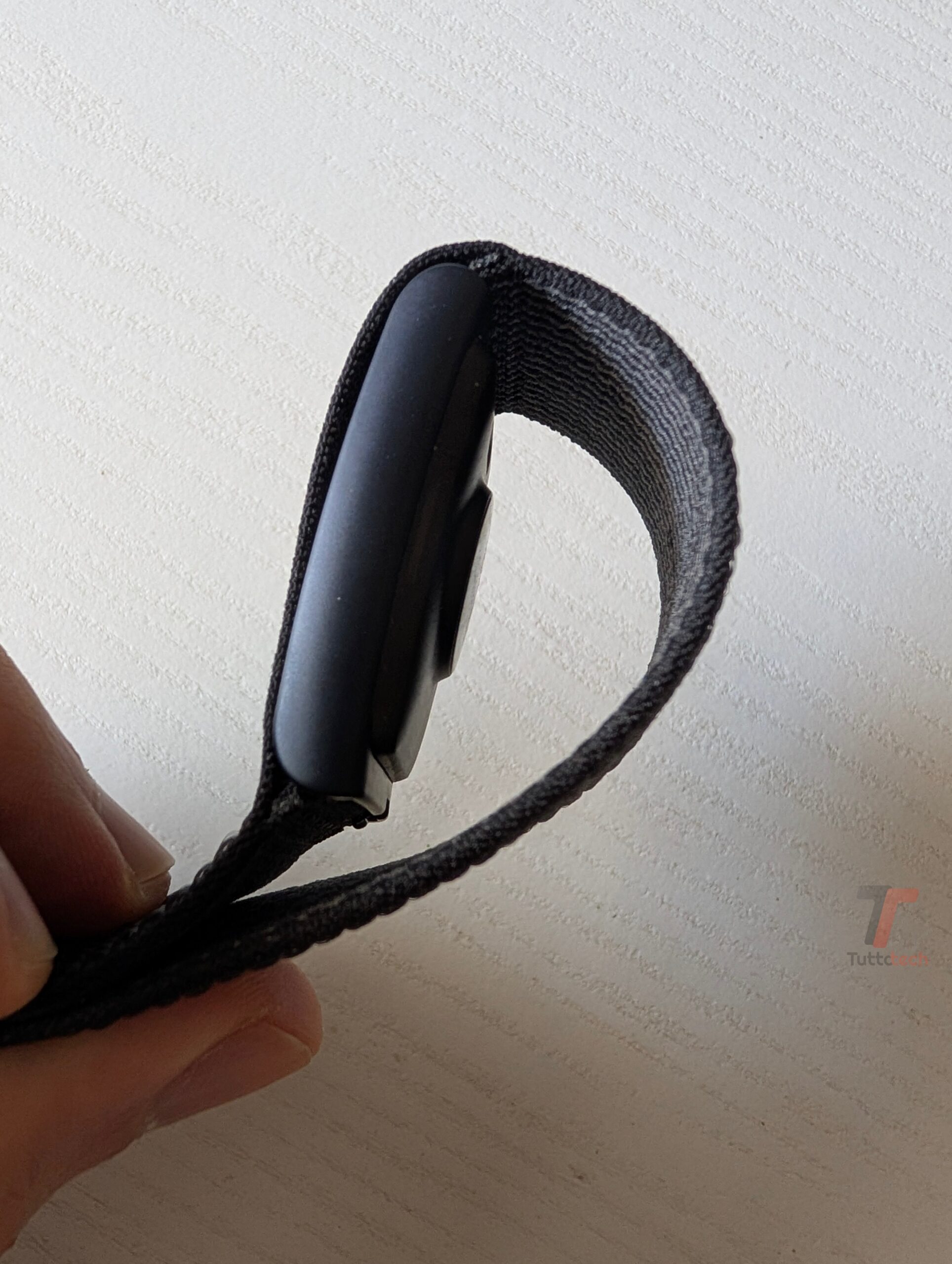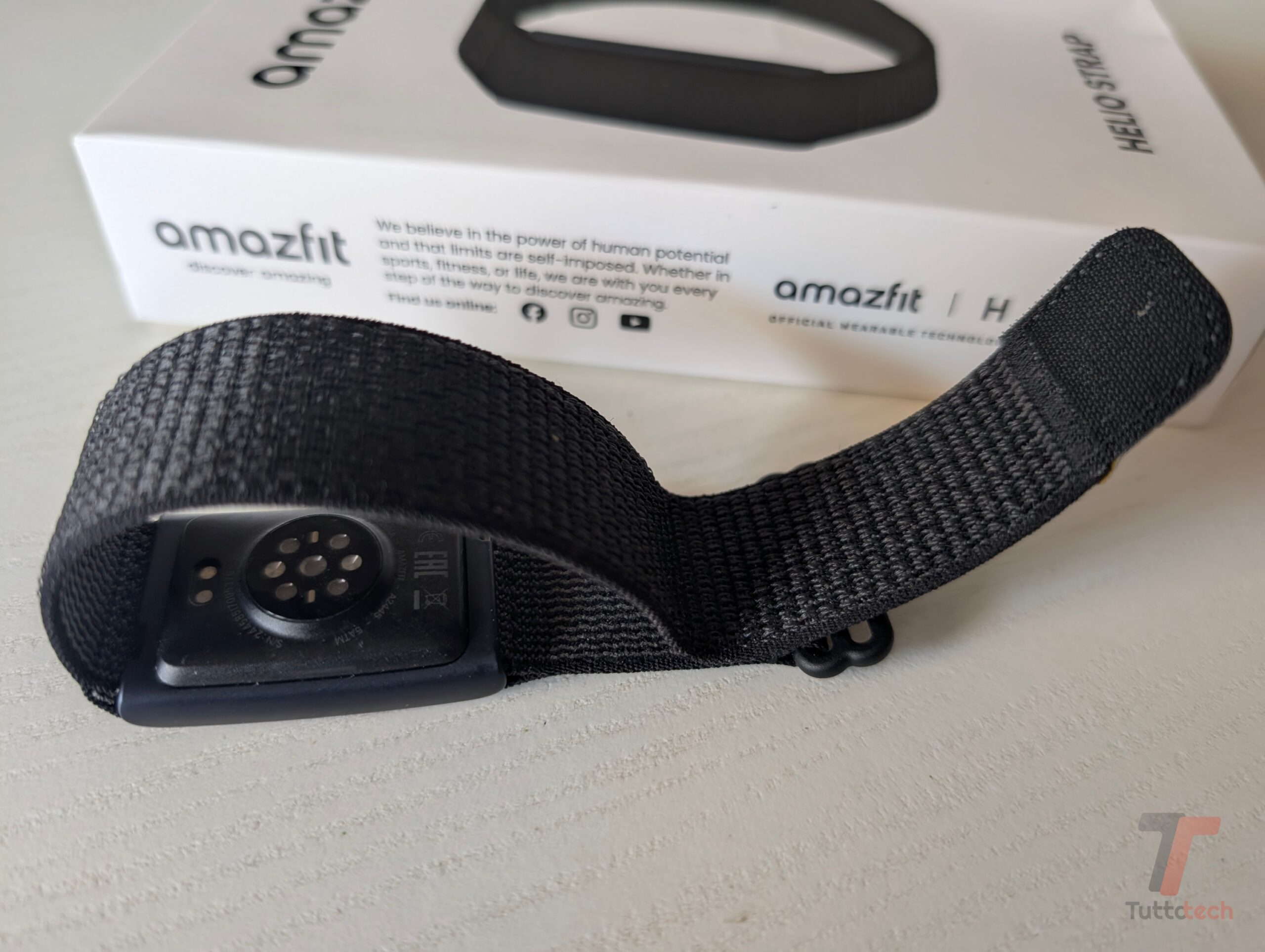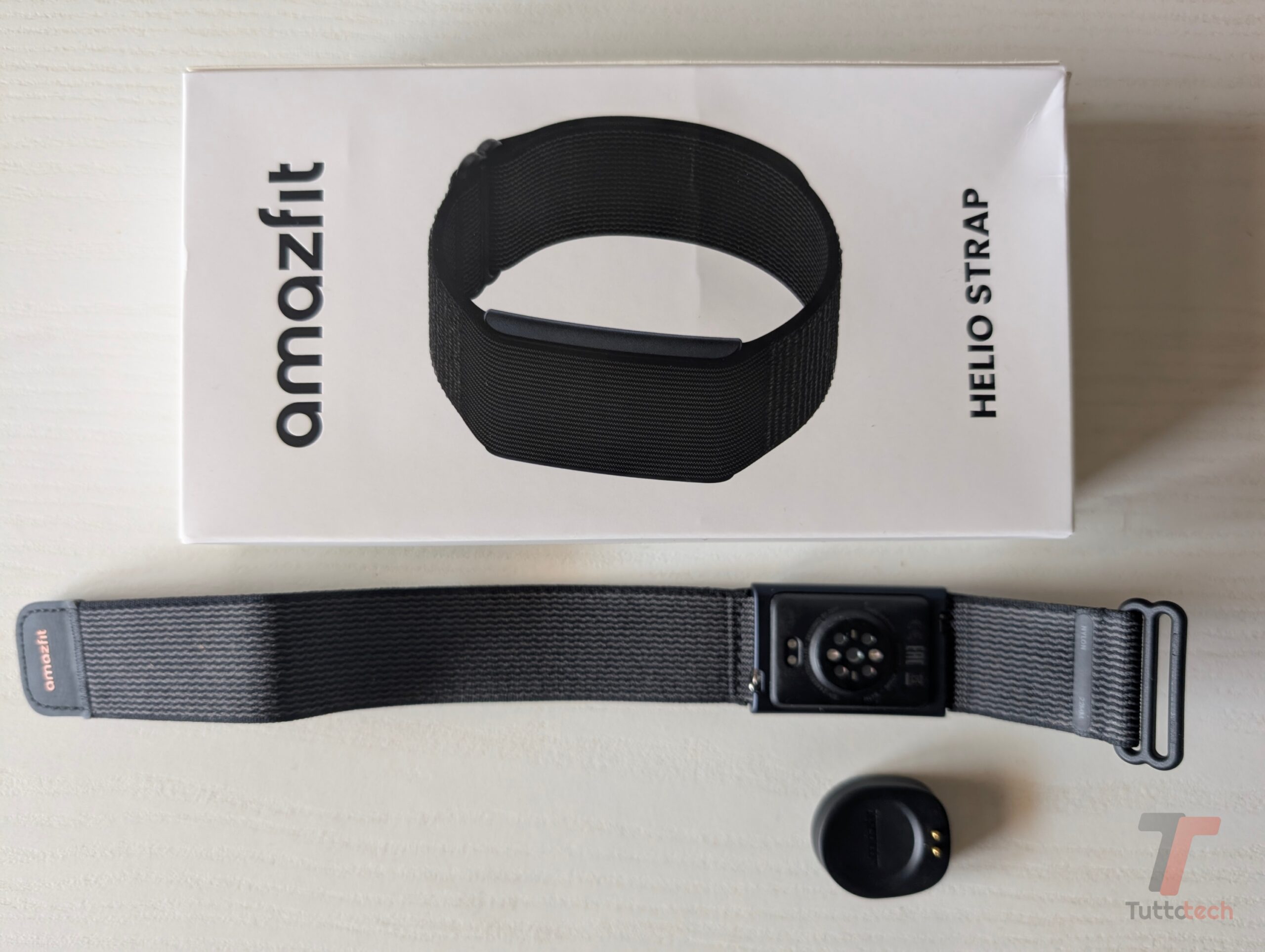 Prima di farlo, però, vediamo un attimo com’è fatto e con che cosa arriva a casa. Amazfit Helio Strap arriva in una confezione di forma rettangolare con dentro un cinturino in tessuto, una basetta per la ricarica e qualche manuale rapido d’istruzioni; poi non c’è altro all’interno della confezione, nemmeno un cinturino di ricambio. Riguardo a com’è costruito e al design c’è ben poco da dire perché è una tavoletta di plastica nera sottile e leggera, che è racchiusa all’interno di un cinturino in nylon con chiusura a strappo; nonostante l’utilizzo 24 ore su 24, anche durante l’attività sportiva, è ancora privo di graffi e assemblato alla perfezione, perciò non è per nulla delicato. Nella parte inferiore include i sensori e i pin per la ricarica e su un lato il LED che segnala la fase di ricarica, la ricarica completa e la batteria scarica. Al polso è fra i dispositivi più comodi mai provati perché è discreto, leggero, piccolo e poi non crea alcun tipo di problema alla pelle, anche in caso di sudorazione estrema; da questo punto di vista è assolutamente al top.