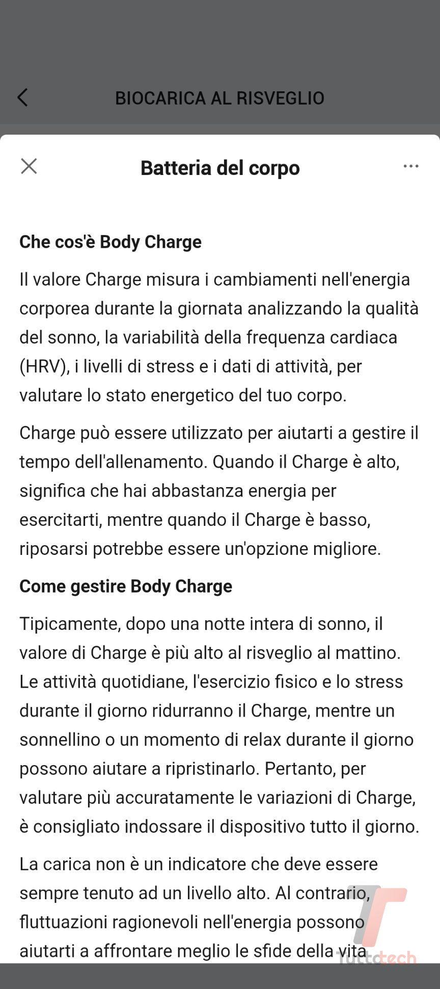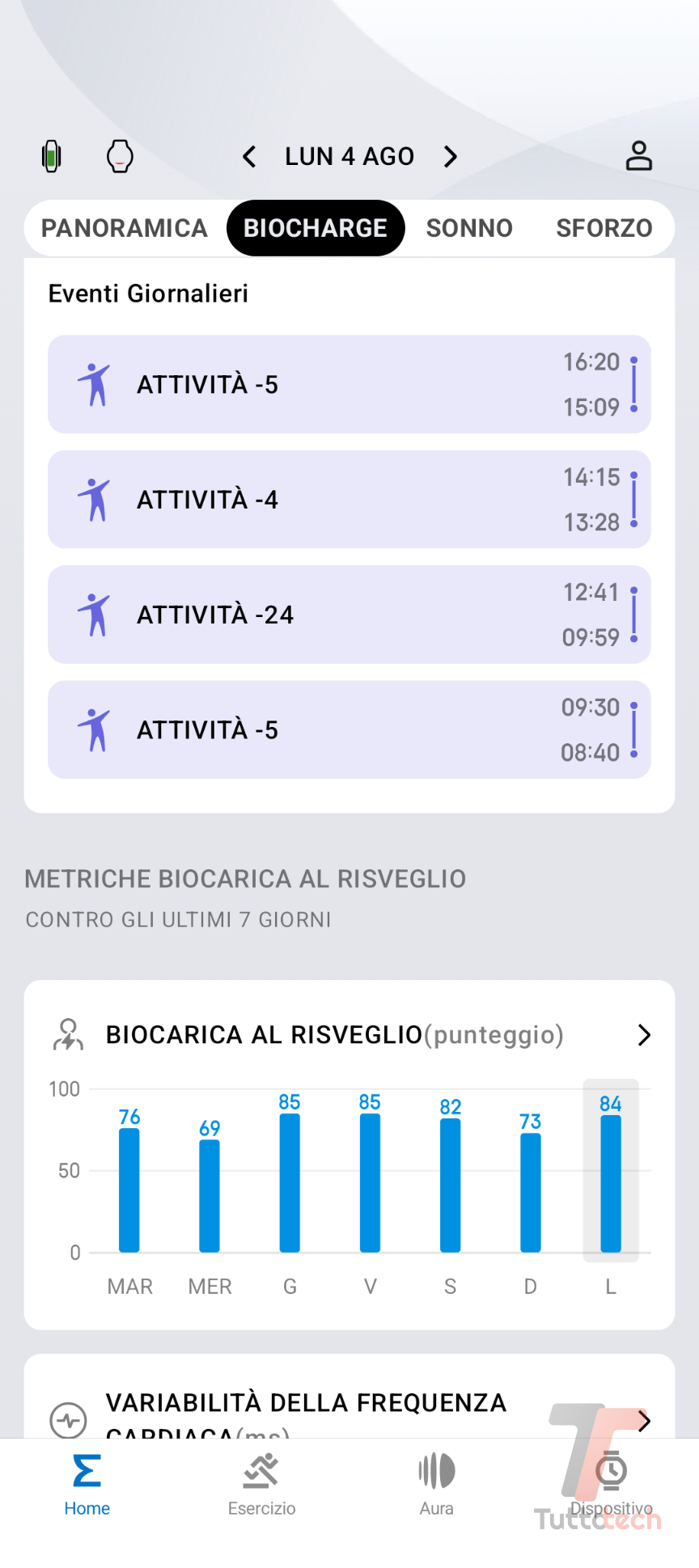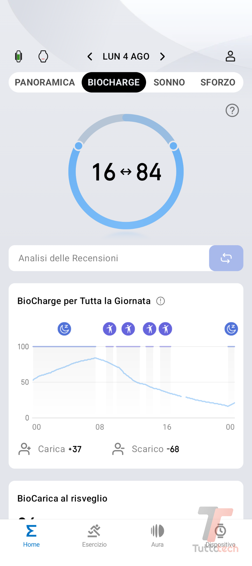Nonostante i sensori siano gli stessi, Amazfit Helio Strap può contare su una funzione software che Amazfit Balance 2 non possiede, chiamata BioCharge, che tiene traccia della ricarica, della carica e della scarica dell’energia fisica e mentale; e, come è facile intuire, richiama e funziona nello stesso modo della Body Battery degli smartwatch di Garmin, perciò non è niente di nuovo in senso assoluto. Comunque, per funzionare, BioCharge sfrutta il monitoraggio dei parametri vitali (stress, HRV, RHR, frequenza respiratoria, temperatura cutanea, SpO2 e frequenza cardiaca in tempo reale), la durata del sonno, i dati vitali raccolti durante il sonno, il riposo giornaliero, i passi percorsi e l’attività fisica svolta: in sostanza “osserva” come e quanto riposiamo durante la notte e i nostri parametri vitali e in base a questo ricarica un valore numerico che ci mostra al risveglio e che poi abbassa gradualmente durante il giorno in base all’andamento dei nostri parametri vitali, dell’attività fisica svolta e al riposo giornaliero.