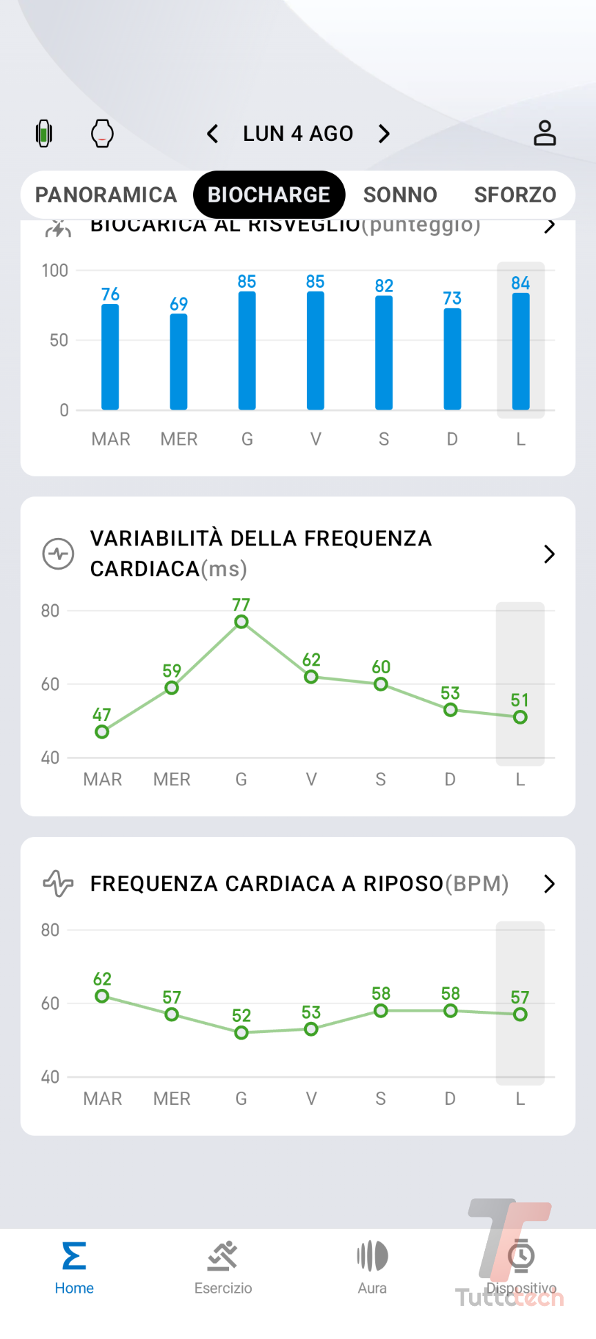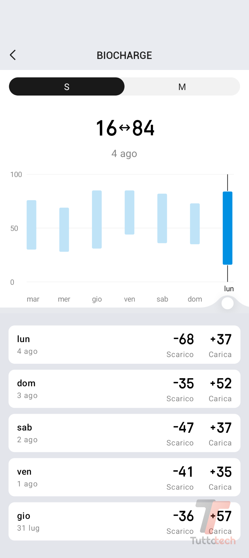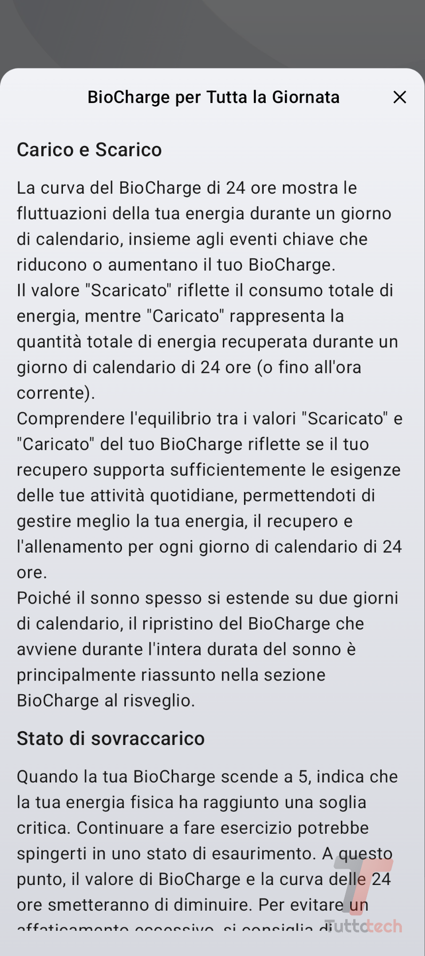 È più o meno la funzione Prontezza presente da anni ma in forma dinamica perché mostra in tempo reale le nostre condizioni fisiche e mentali tracciando l’energia che consumiamo nello svolgere le attività quotidiane; e lo fa attraverso una scheda dedicata all’interno dell’applicazione Zepp dove è possibile vedere tutto questo tramite dei valori numerici, dei grafici e un sacco di dati raccolti di giorno e di notte. Non solo BioCharge è un indicatore facile da comprendere e ricco di informazioni ma è anche estremamente affidabile perché sa sempre come ci sentiamo e qual è la nostra energia durante la giornata; i dati sono raccolti in maniera accurata sia di giorno che di notte e le attività vengono registrate in maniera corretta e quindi vien da sé che la scarica non può che essere coerente e attendibile. Amazfit Helio Strap è per il momento l’unico dispositivo dell’azienda a poter vantare questa funzione e quindi è l’unico che riesce a dare qualcosa in più rispetto agli altri modelli e questo è di sicuro un valore aggiunto per chi fa sport o per chi vuole tenersi banalmente solo in forma e in salute.