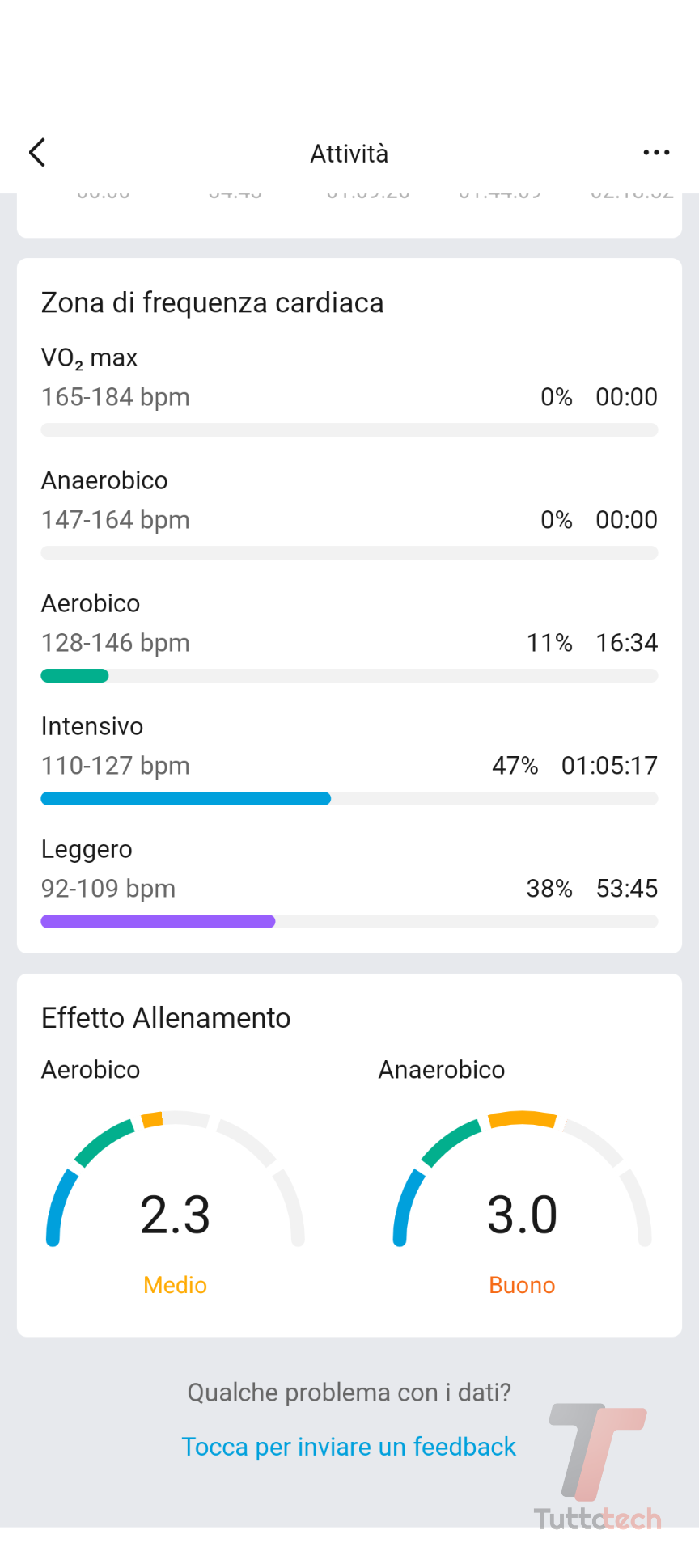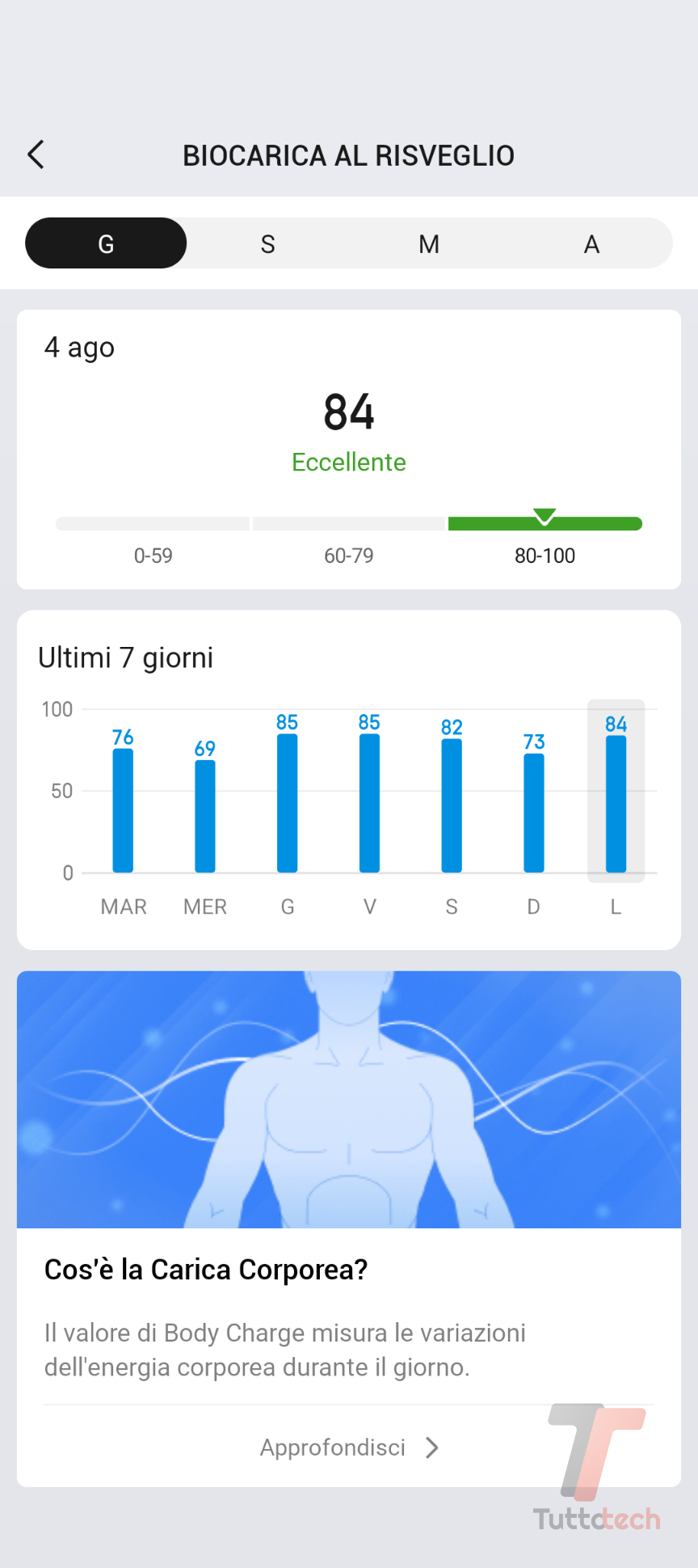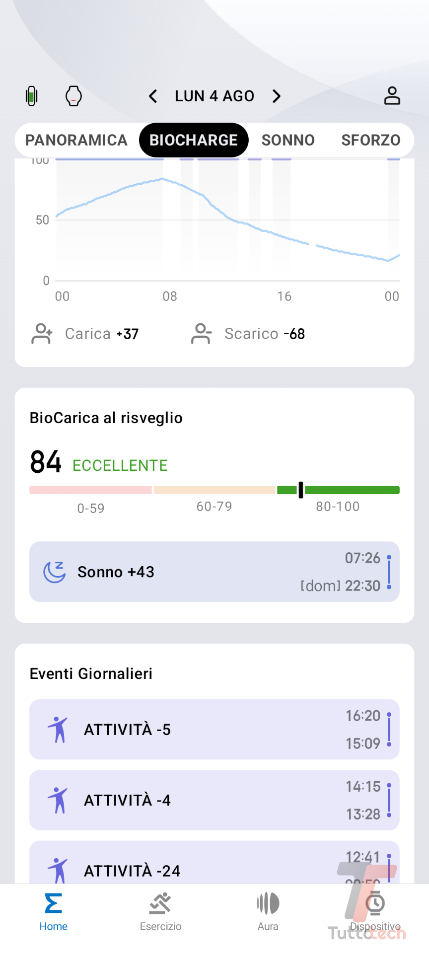 È più o meno la funzione Prontezza presente da anni ma in forma dinamica perché mostra in tempo reale le nostre condizioni fisiche e mentali tracciando l’energia che consumiamo nello svolgere le attività quotidiane; e lo fa attraverso una scheda dedicata all’interno dell’applicazione Zepp dove è possibile vedere tutto questo tramite dei valori numerici, dei grafici e un sacco di dati raccolti di giorno e di notte. Non solo BioCharge è un indicatore facile da comprendere e ricco di informazioni ma è anche estremamente affidabile perché sa sempre come ci sentiamo e qual è la nostra energia durante la giornata; i dati sono raccolti in maniera accurata sia di giorno che di notte e le attività vengono registrate in maniera corretta e quindi vien da sé che la scarica non può che essere coerente e attendibile. Amazfit Helio Strap è per il momento l’unico dispositivo dell’azienda a poter vantare questa funzione e quindi è l’unico che riesce a dare qualcosa in più rispetto agli altri modelli e questo è di sicuro un valore aggiunto per chi fa sport o per chi vuole tenersi banalmente solo in forma e in salute.