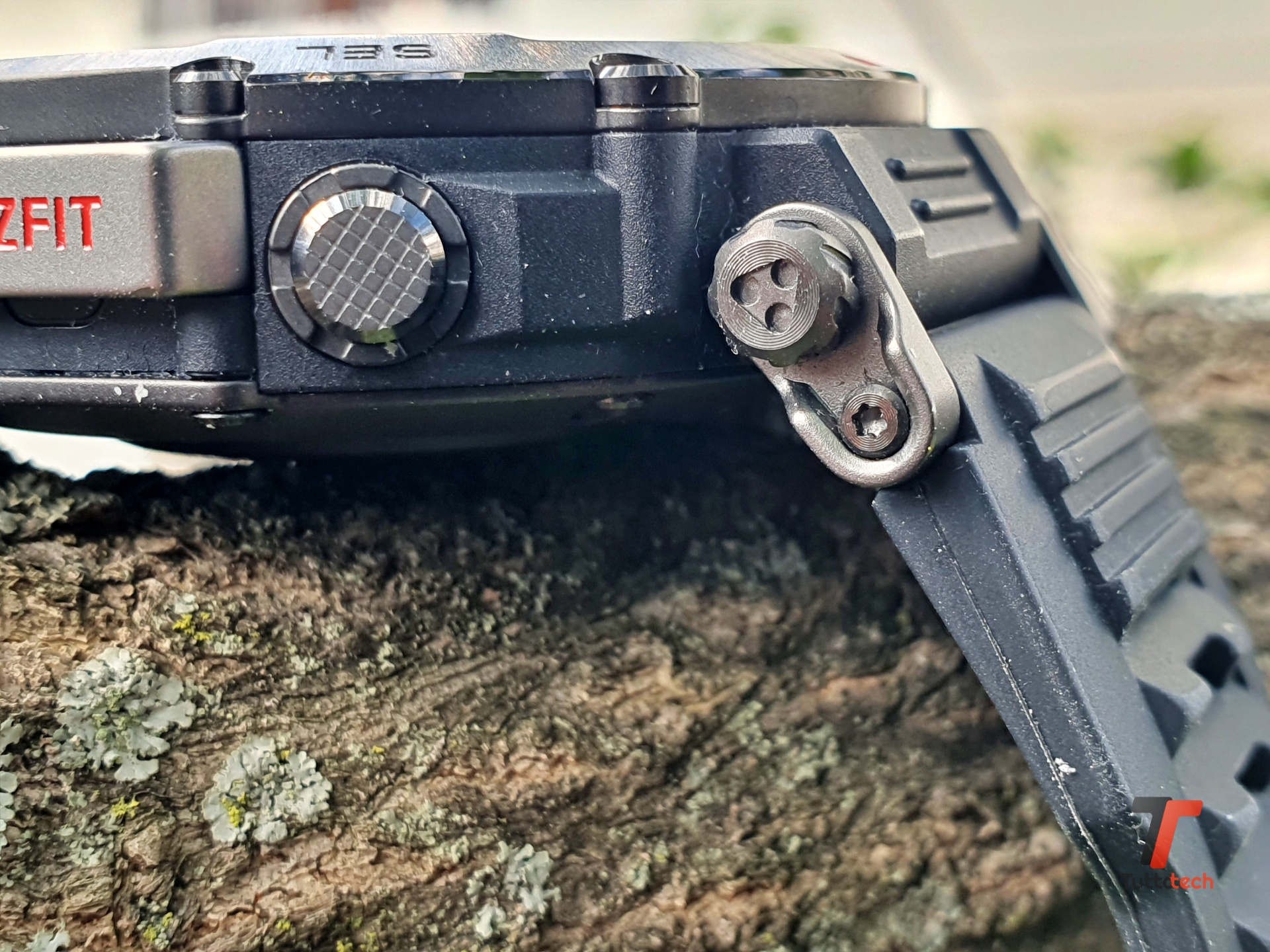 Molto bello, sia dal punto di vista del design sia da quello prettamente funzionale, il nuovo sistema di aggancio del cinturino, che Amazfit afferma non essere rimovibile (almeno non facilmente). Invece del cinturino collegato direttamente alla cassa dello smartphone, è presente una sorta di cerniera che permette allo smartwatch di adattarsi perfettamente al polso, consentendo alla parte inferiore di poggiare bene sulla pelle e riducendo al minimo gli spazi vuoti.