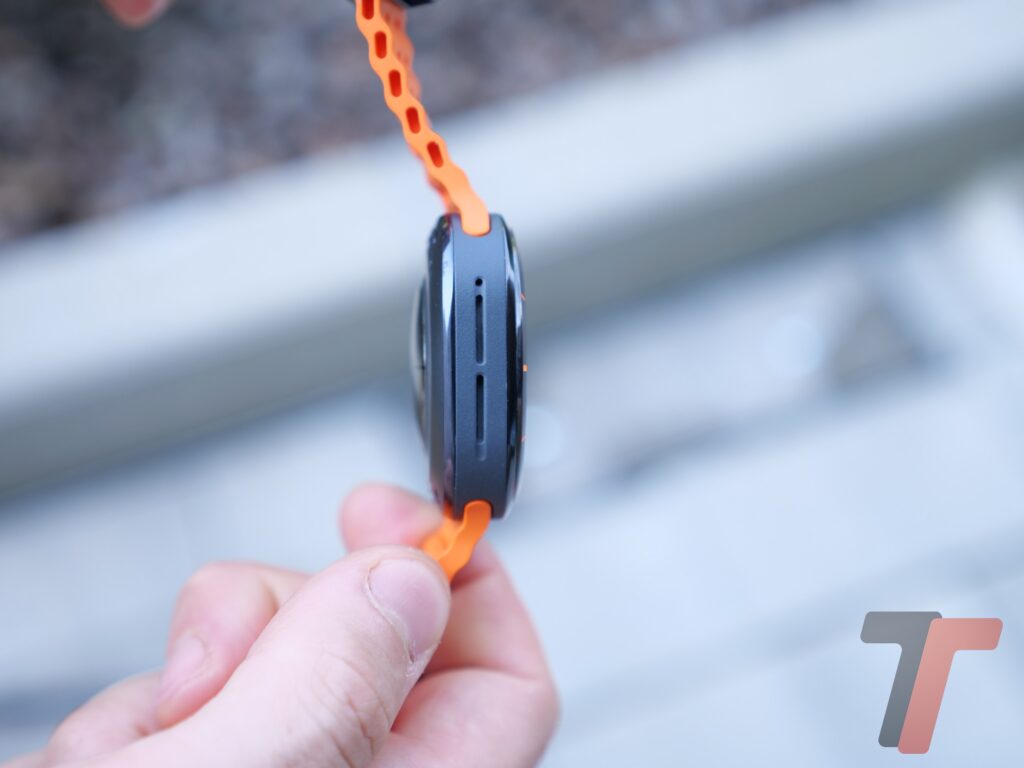 Il design è un punto cruciale di Samsung Galaxy Watch Ultra, la cassa è realizzata in un misto di titanio aerospaziale, titanio di grado 2 e policarbonato, è disponibile in colorazione nera, silver e bianca, in tutti i casi troviamo il tasto centrale con contorno arancione e altri dettagli della medesima colorazione. La ghiera più esterna non è rotabile, mentre sul lato destro trovano posto tre tasti di cui quello centrale chiamato “pulsante rapido” che si può personalizzare per attivare funzioni speciali o avviare allenamenti. Durante la pratica sportiva poi è molto comodo perché grande e rialzato, facilmente riconoscibile sotto i polpastrelli e utile per mettere in pausa e far ripartire il tracciamento.