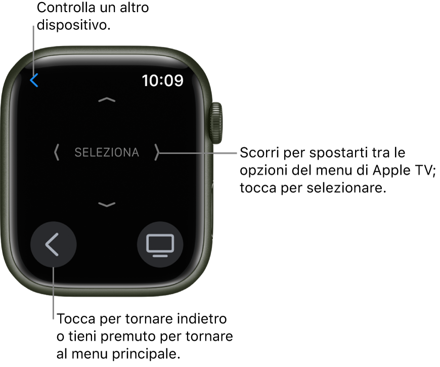 - Verrà mostrata un’interfaccia (visibile nell’immagine sottostante fornita da Apple) caratterizzata da uno sfondo nero, con in alto una freccia blu per tornare indietro e selezionare un altro dispositivo da controllare, al centro il pad direzionale per spostarsi tra i menu (nel centro è presente il tasto “Seleziona”), in basso a sinistra una freccia (pulsante menu) che consente di tornare indietro o, tenendola premuta, di tornare al menu principale e in basso a destra l’icona TV che consente di tornare alla schermata principale.