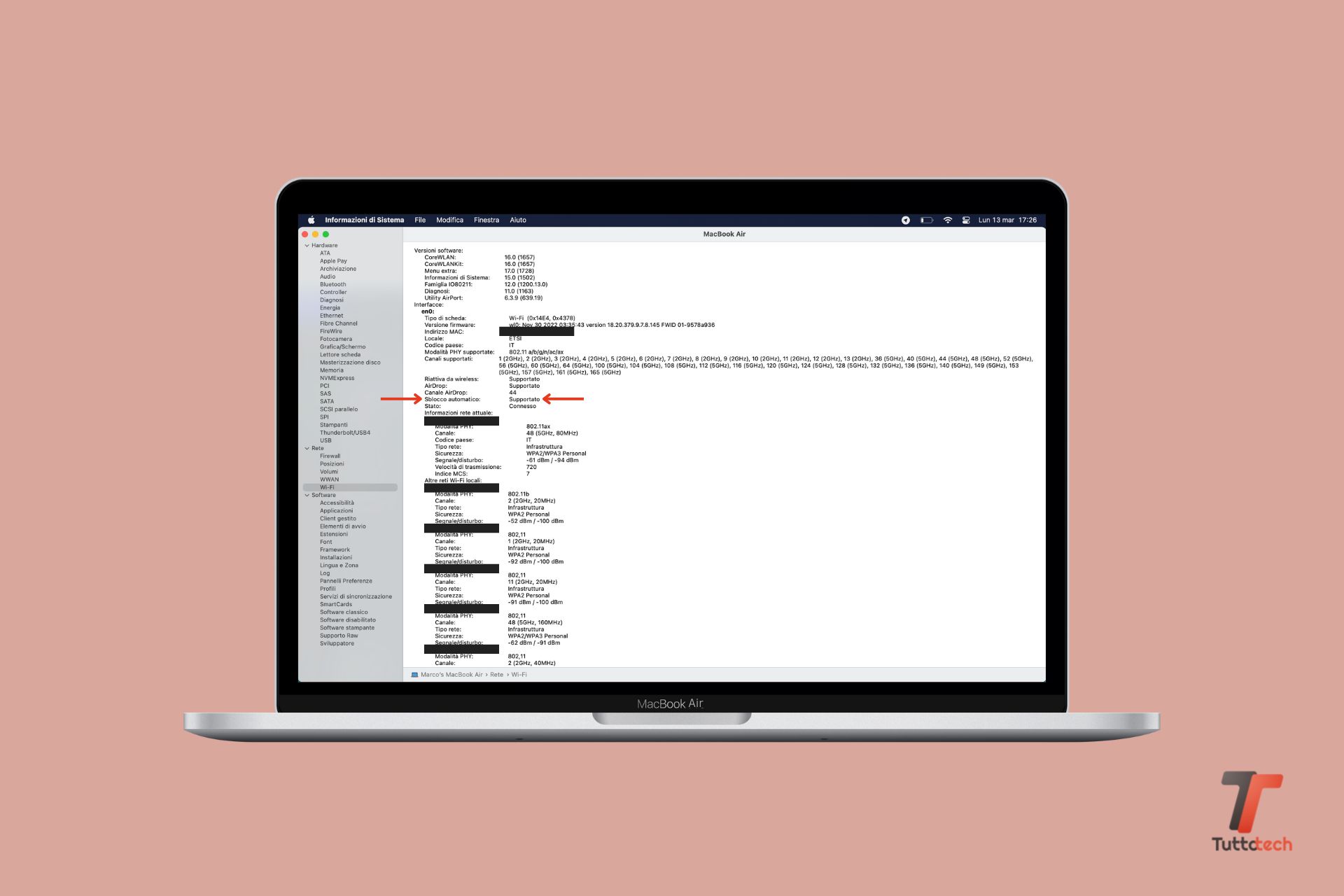 In teoria, qualsiasi modello di computer Mac della seconda metà del 2013 o successivo dovrebbe essere compatibile con la funzionalità ma è comunque meglio esserne sicuri, pertanto basta seguire il percorso “Apple > Informazioni su questo Mac > Rapporto di sistema > Informazioni su questo Mac > Rete > Wi-Fi” e controllare che nella sezione “Interfacce” risulti supportato lo sblocco automatico.