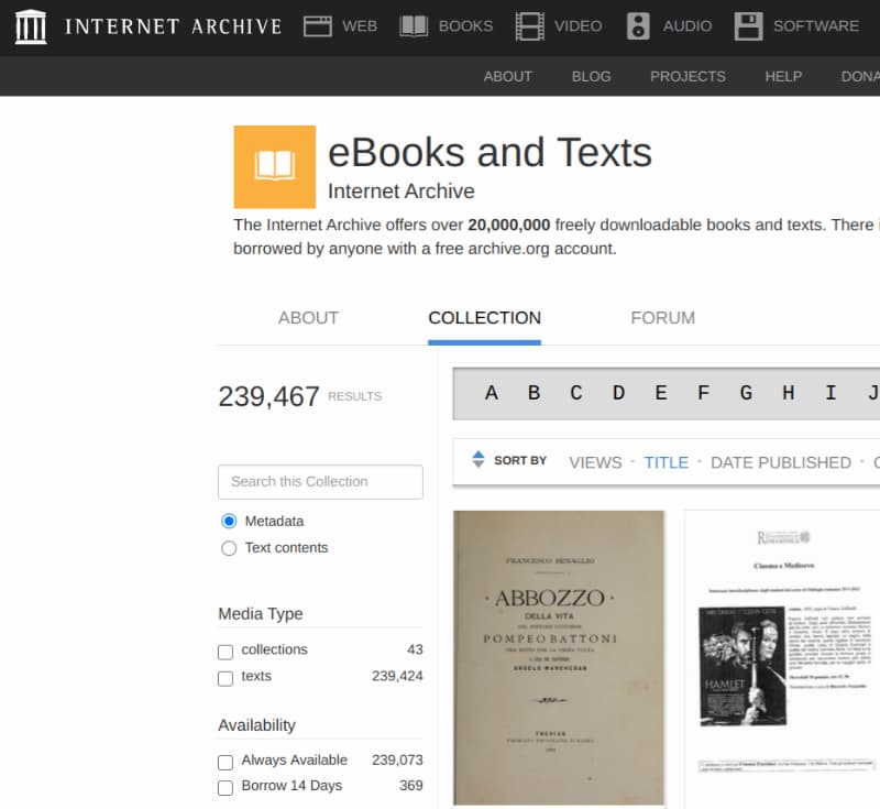 Ancora non esiste, a livello globale, qualcosa di paragonabile ad Archive.org, la più grande libreria digitale al mondo. Basta un solo numero per comprendere le proporzioni bibliche del sito: 451 miliardi di contenuti online archiviati tra libri, film e musica. L’unico neo, rispetto ad altri servizi elencati qui sopra, riguarda la lingua dei documenti. Difatti, molte delle opere è in lingua inglese, ma effettuando una semplice ricerca in italiano il problema viene agevolmente superato.