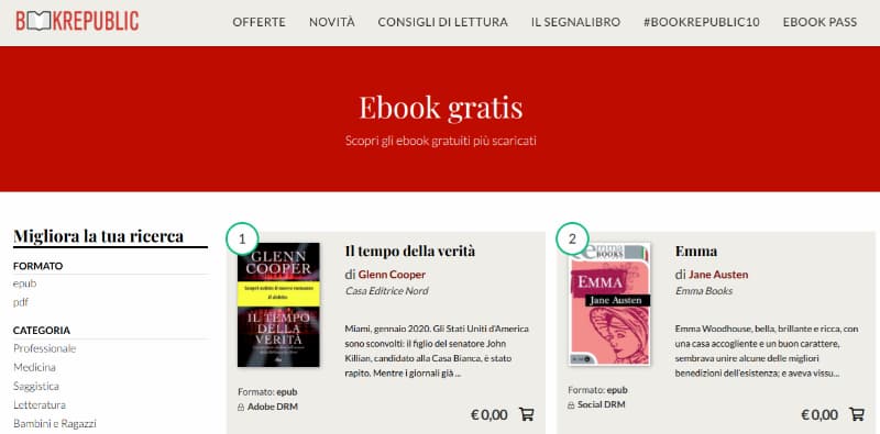 Impossibile non citare Bookrepublic, la prima libreria italiana online di eBook a partire dal 2010, quando ancora il formato digitale dei libri era concepito più come fantascienza che come realtà nel breve-medio termine. La maggior parte delle opere contenute su Bookrepublic è a pagamento, ma c’è anche un importante spazio dedicato agli eBook gratuiti, dove trovare un buon libro da leggere alla sera o nel fine settimana non è certo un’impresa così difficile.