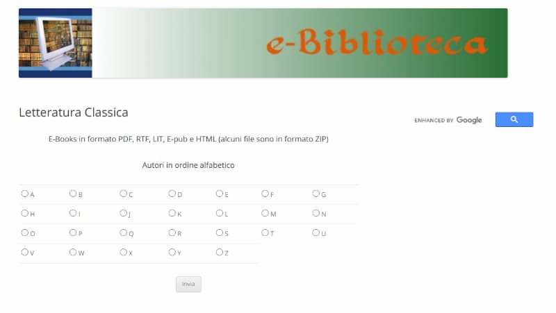 Per scaricare un libro da E-Biblioteca collegati alla homepage (a questo indirizzo) e clicca su Entra. Nella nuova schermata, scegli dal menu il genere letterario che più ti stimola, quindi seleziona la lettera con cui inizia l’autore che vuoi cercare e pigia sul tasto Invia per eseguire la ricerca. Arrivati a questo punto, comparirà un elenco con tutti gli autori e le opere da loro scritte: clicca sul link del libro desiderato e attendi l’avvio del download automatico. Di solito, per completare il salvataggio dell’eBook nella memoria del computer trascorrono soltanto un paio di secondi.