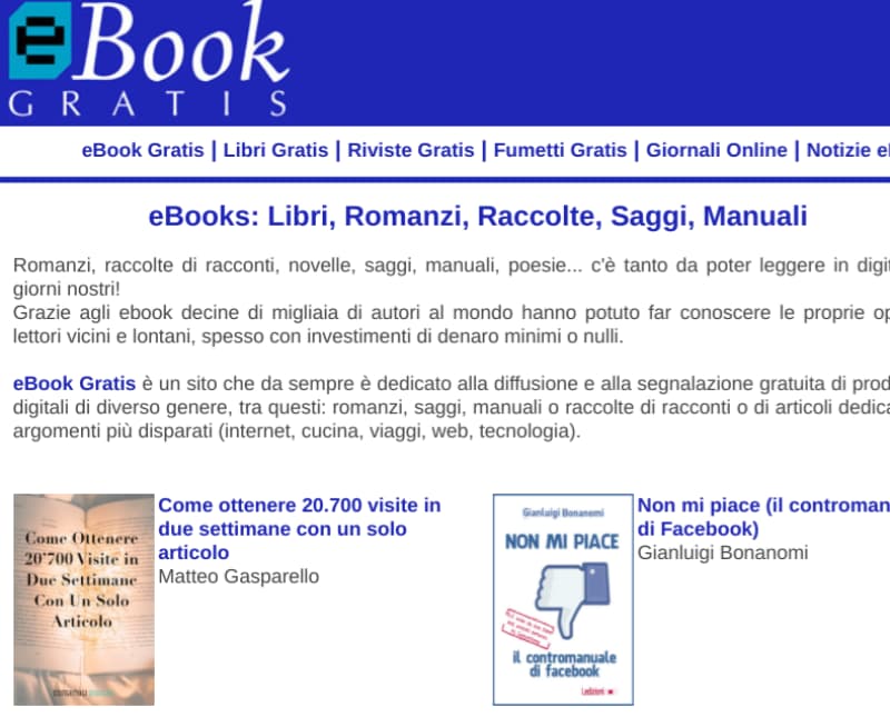 Altro progetto italiano, ma più orientato ad autori emergenti e tematiche non propriamente letterarie, come ad esempio manuali rivolti alle persone che lavorano con il computer e vorrebbero trasformare la loro passione in qualcosa di più di un semplice passatempo: stiamo parlando di eBook Gratis, portale di riferimento per scaricare libri gratis, oltre a fumetti, giornali e riviste.