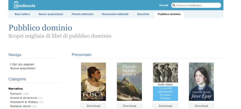 La libreria digitale Feedbooks vanta un primato di tutto rispetto: essere stata la prima a offrire la possibilità di scaricare libri online gratis in formato ePub. Nonostante il numero di eBook presenti in catalogo sia inferiore rispetto a quello di altri portali simili, Feedbooks rappresenta un’ottima scelta se si ha l’interesse a riscoprire i grandi autori del Novecento e titoli evergreen che non passeranno mai di moda. Il genere letterario che offre più libri è il romanzo (oltre 100), seguito da azione e avventura.