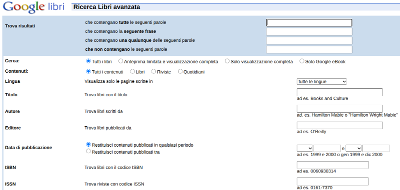 Per sapere subito se l’opera che cerchi figura tra i libri in PDF scaricabili gratuitamente, ti consigliamo di usare lo strumento di Ricerca Avanzata disponibile a questo link. Ora, dove vedi la sezione Trova risultati, digita nel primo campo il nome del libro. Più sotto, alla voce Cerca, aggiungi il segno di spunta accanto a Solo visualizzazione completa. Le altre impostazioni, invece, puoi lasciarle così come sono. Clicca quindi sul tasto Cerca con Google per avviare la ricerca.